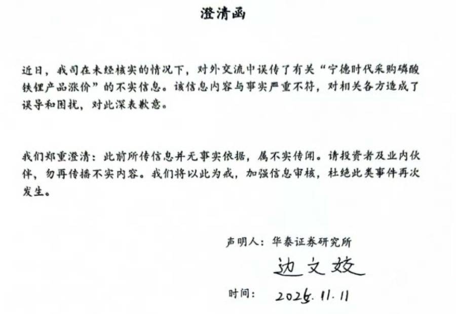 不过,当日晚间,一份相关澄清函突然在坊间疯传,迅速引发市场关注。落款显示,该澄清函的声明人为华泰证券研究所电新分析师边文姣,出具时间为2025年11月11日,但并无华泰证券及其研究所加盖的公章。